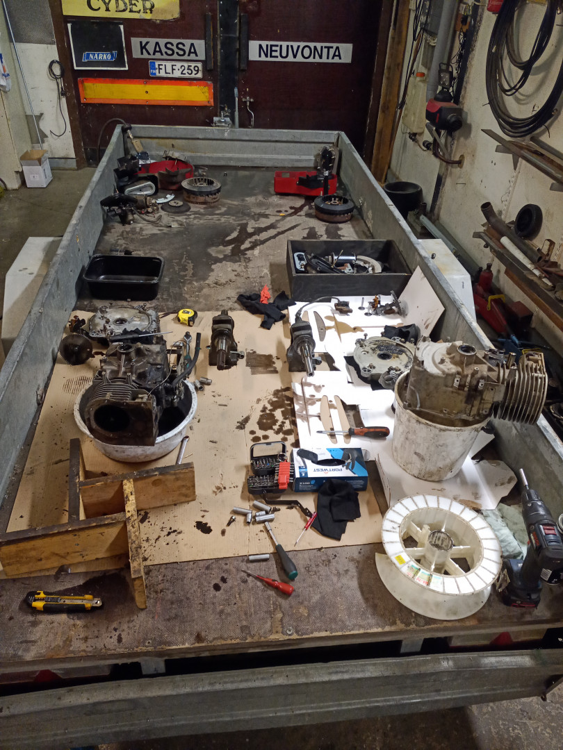 Kaksi purettu ja kaksi kasattu mutta kolmea konetta kannibalisoitu, paremmat osat kasattu tähän villaan menevään moottoriin josta tais tulla pirun hyvä :D Toki se on vain nakattu tuohon eikä ole vielä kytketty mihinkään mutta huikkabensalla pärähti heti ku vähä kokeilin. Korjauskustannus lohkon hitsuutus tig-hitsarilla 39€ ja tiivistesarja 60€